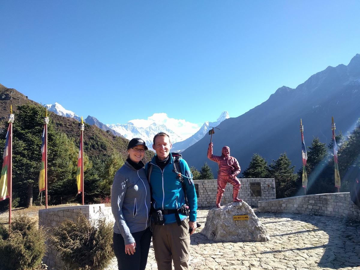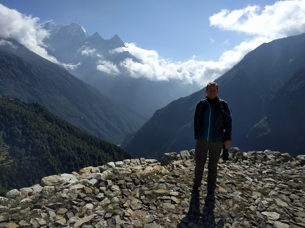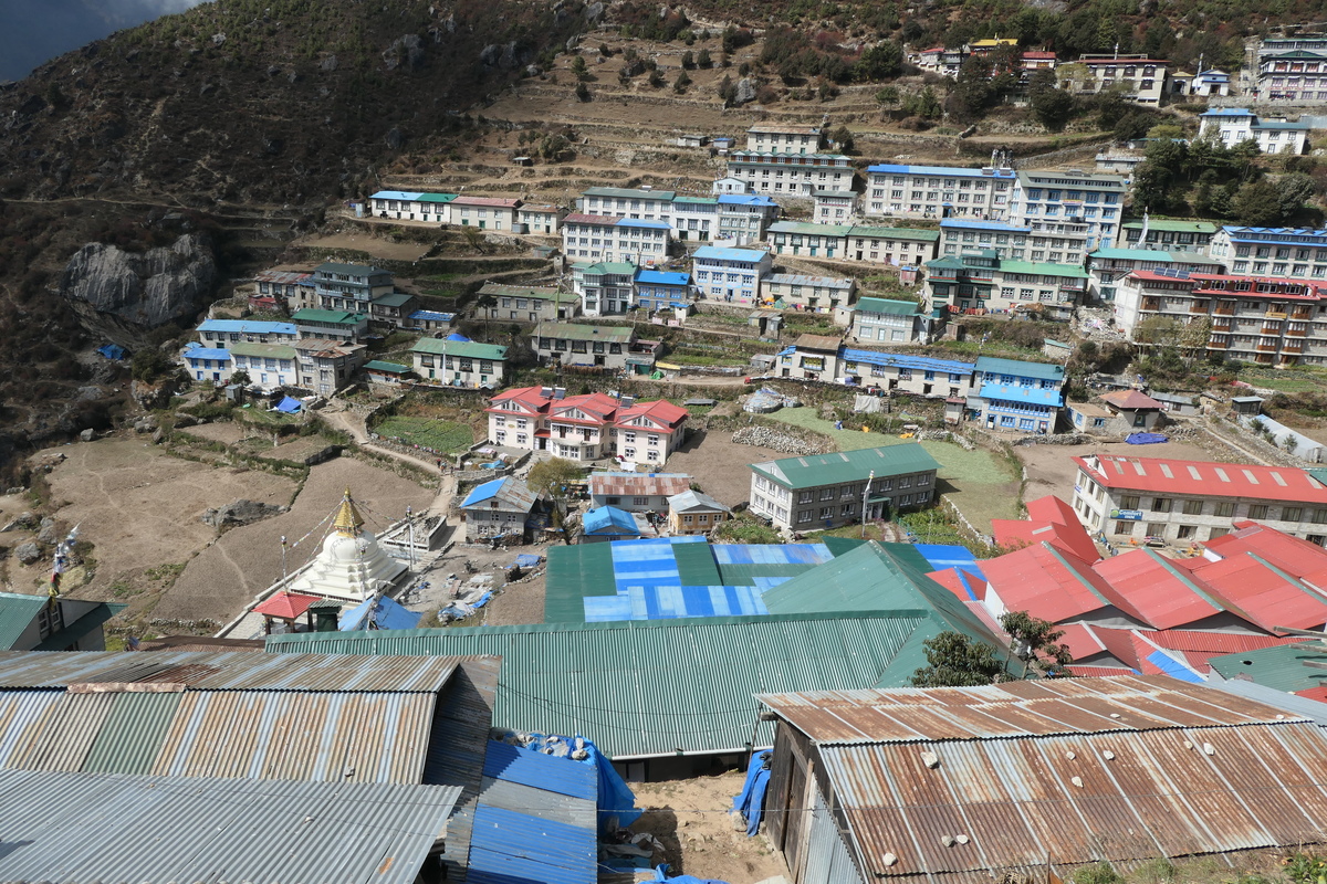 Der vierte Tag ist eigentlich als Akklimatisierungstag angedacht, dass heisst, hochwandern und wieder in Namche Bazaar schlafen. An diesem vierten Tag geht es Miri auch wieder viel besser, aber Manraj entscheidet, dass wir nicht den geplanten Akklimatisationshike zum Japanischen Teahouse machen sondern nur im Ort ein wenig hochlaufen, in ein Museum gehen und Miri sich erholen kann. Tim findet das etwas verschenkte Zeit, aber: die Sonne scheint und Miri merkt schon die Meter zum Aussichtspunkt hoch und zum Museum im Magen und im Kopf. Der Aussichtspunkt hat einen tollen Blick auf den Ama Dablam.