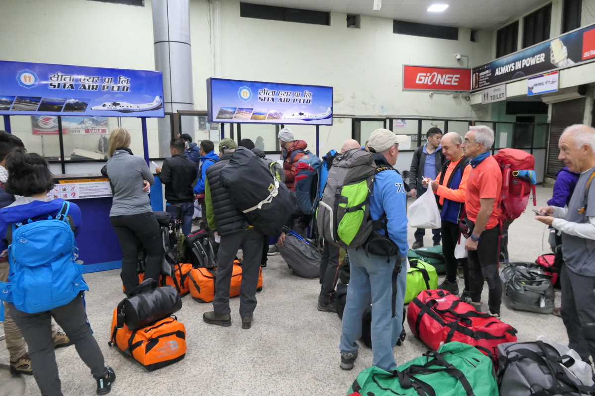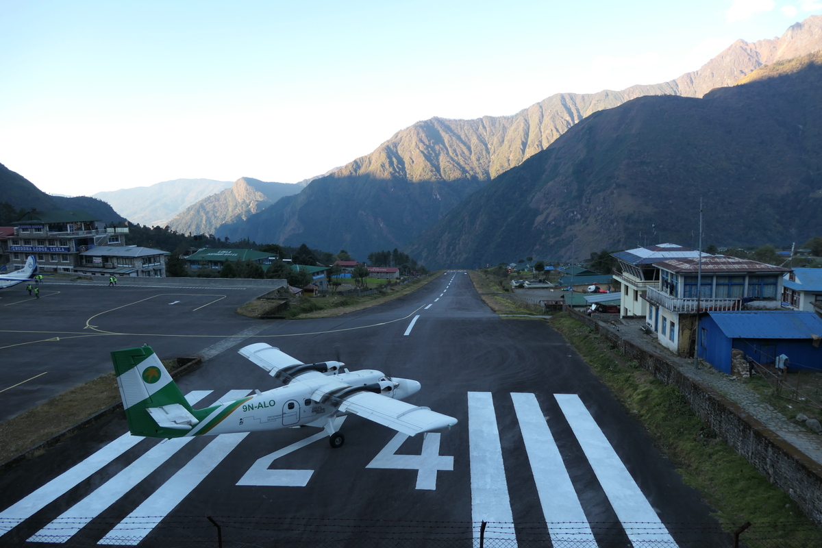Ein winziger Flieger: kleiner Mittelgang, 6 Plätze auf jeder Seite. Wir sitzen ganz vorne und können ins offene Cockpit sehen. Glücklicherweise gehen die 25 Minuten Flug viel ruhiger vorbei als erwartet und die Landung (wir rasen auf die Bergwand zu) verläuft auch gut.