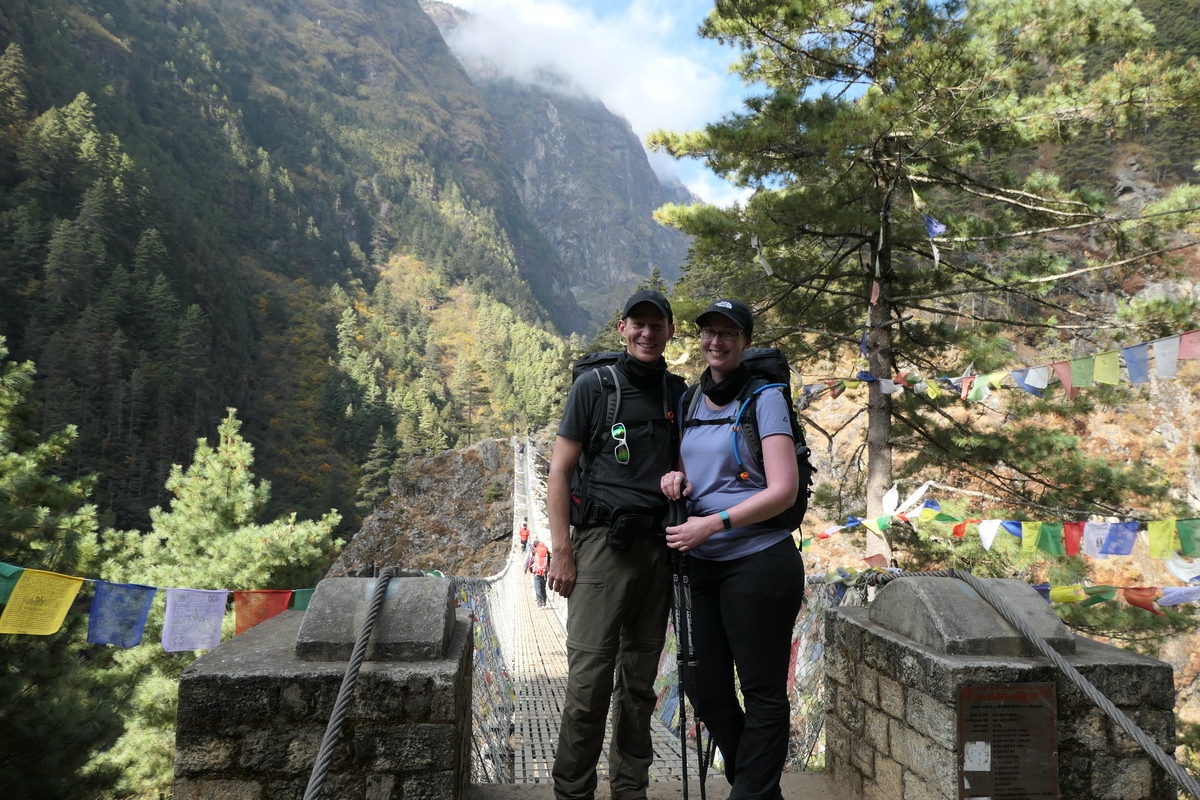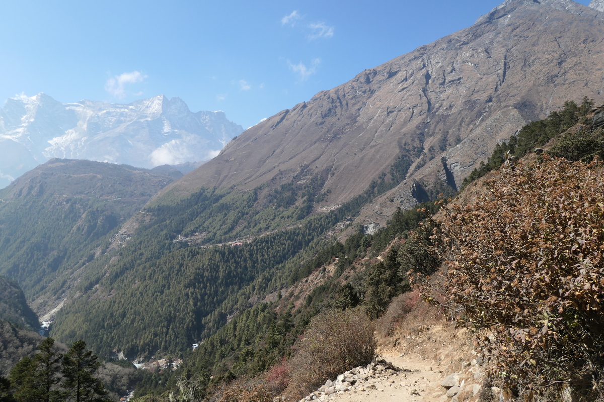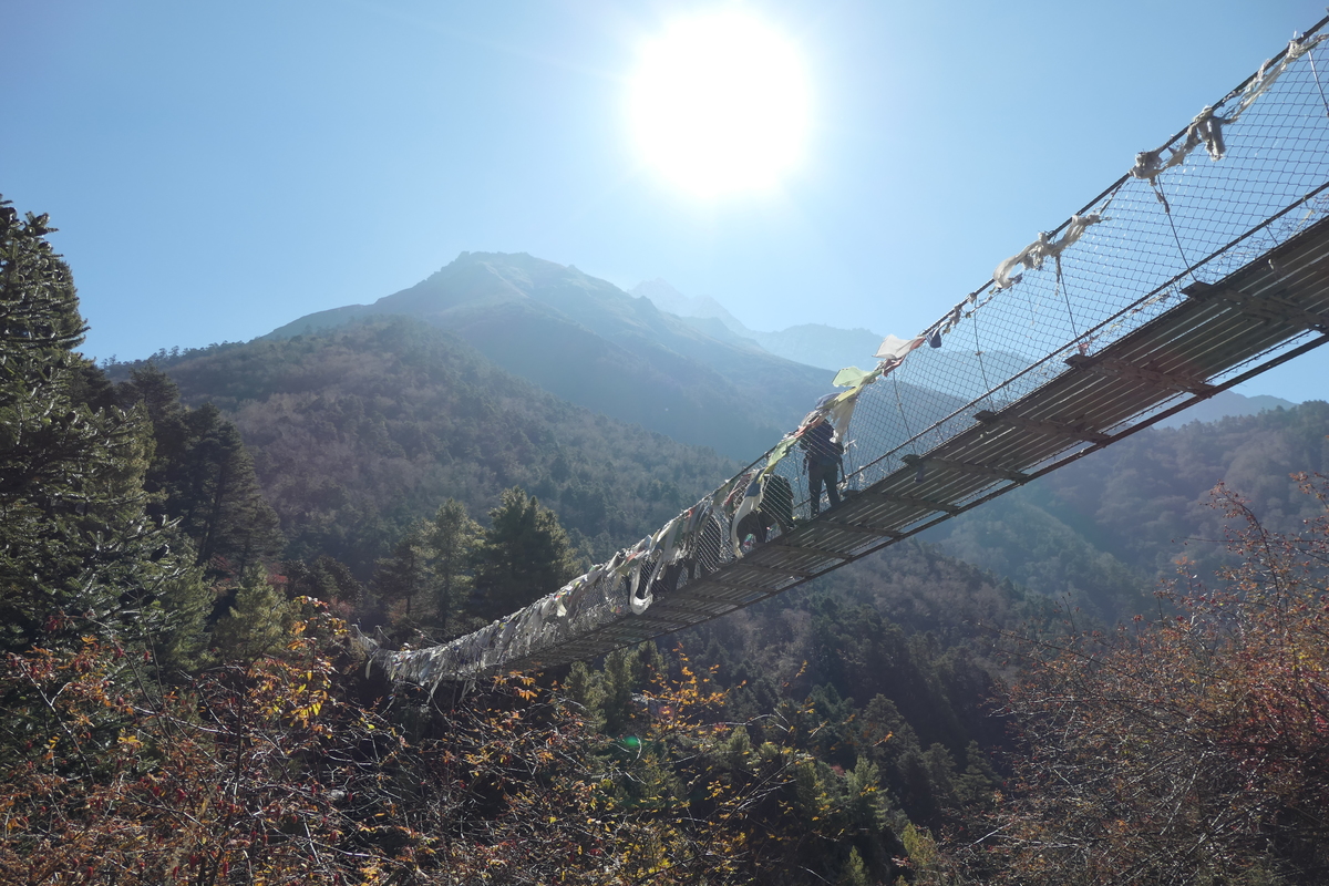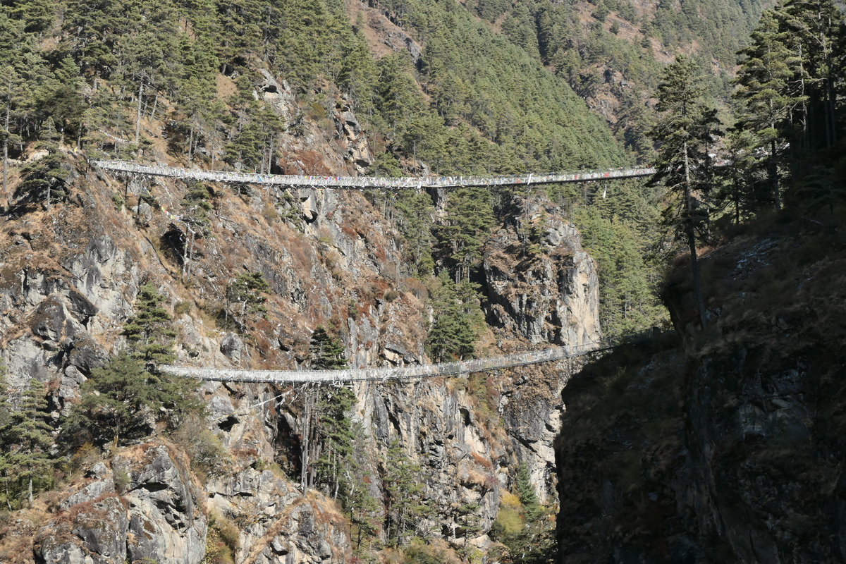 Zunächst entspricht der Weg dem bereits beschriebene Nepali Flat, dann geht es ziemlich bergab. Wir rennen hinunter hinunter hinunter. Anschliessend führt uns Manraj durch ein tiefes Tal über eine spektaktuläre Hängebrücke. Danach geht es hoch bis Tengboche (3876m). Der Anstieg ist sehr streng! Es geht hoch, hoch, hoch, hoch. Zusätzlich ist es heiss. T-Shirt Wetter ist angesagt. Wir haben etwas dazu gelernt von Namche und lassen uns sehr viel Zeit, gehen gemütlich, achten darauf gut zu atmen und vor allem in der Hitze viel zu trinken. Es scheint gut zu gehen, denn wir kommen gut hinauf. Nach Manrajs Warnung, dass es schwierig werden wird, sind wir stolz, dass es so gut geklappt hat bis hier oben.
