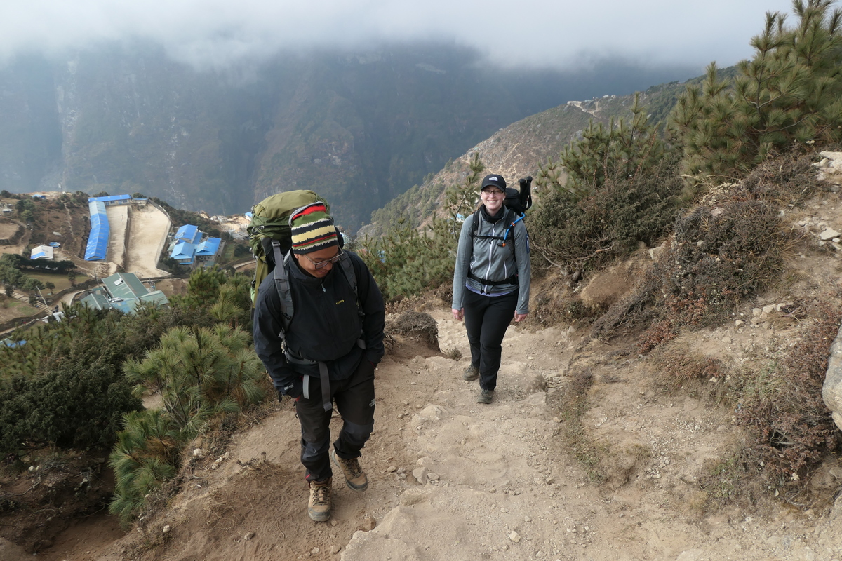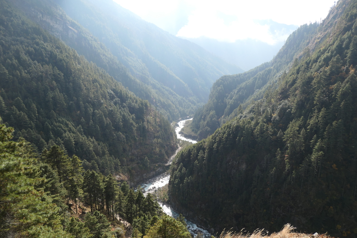 Es geht ein wenig bergauf, ein wenig bergab, “the Nepali flat”. Es kommen uns viele Karawanen von beladenen Yaks und Maultieren sowie einige Träger vollbeladen entgegen; auch viele Trekker - die kaputt aussehen. Sie kommen herunter, warum sehen sie denn hier so kaputt aus? (SPOILER: Wir wissen jetzt warum!) Wir merken ein wenig die Höhe. Es ist warm und unsere Mägen spüren die Aufregung. Trotzdem fühlt es sich gut an: Endlich loslaufen! Wir haben schon lange an diesen Tag gedacht, so lange uns auf diese 16 Tage vorbereitet (gut, so lange auch wieder nicht, ein paar Monate…).