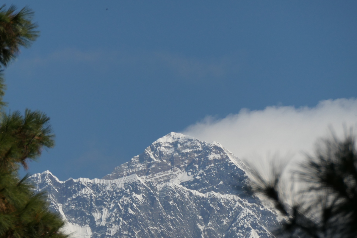 Der dritte Trekkingtag führt uns steil bergauf nach Namche Bazaar. Zunächst noch flach an einem Flussbett entlang, dann über RIESIGE Hängebrücken. Auch Yaks überqueren diese problemlos. Nur wir halten kurz den Atmen an (vor Staunen, diese wunderschöne Landschaft; und ein bischen auch wegen der Höhe). Die Sonne scheint stark. Miri ist sehr ausser Atem beim Laufen. Es geht bergauf bergauf bergauf. Nur wenig kleine Pausen. Unterwegs treffen wir die beiden Deutschen, David und Samantha wieder. Und eine Gruppe älterer Deutscher, Miri unterhält sich mit den Frauen über das Haarewaschen ;). Von einem View Point aus sieht man den Everest. Wow! Was für ein Anblick! Aber der ist auch noch ziiiiiiemlich weit weg…