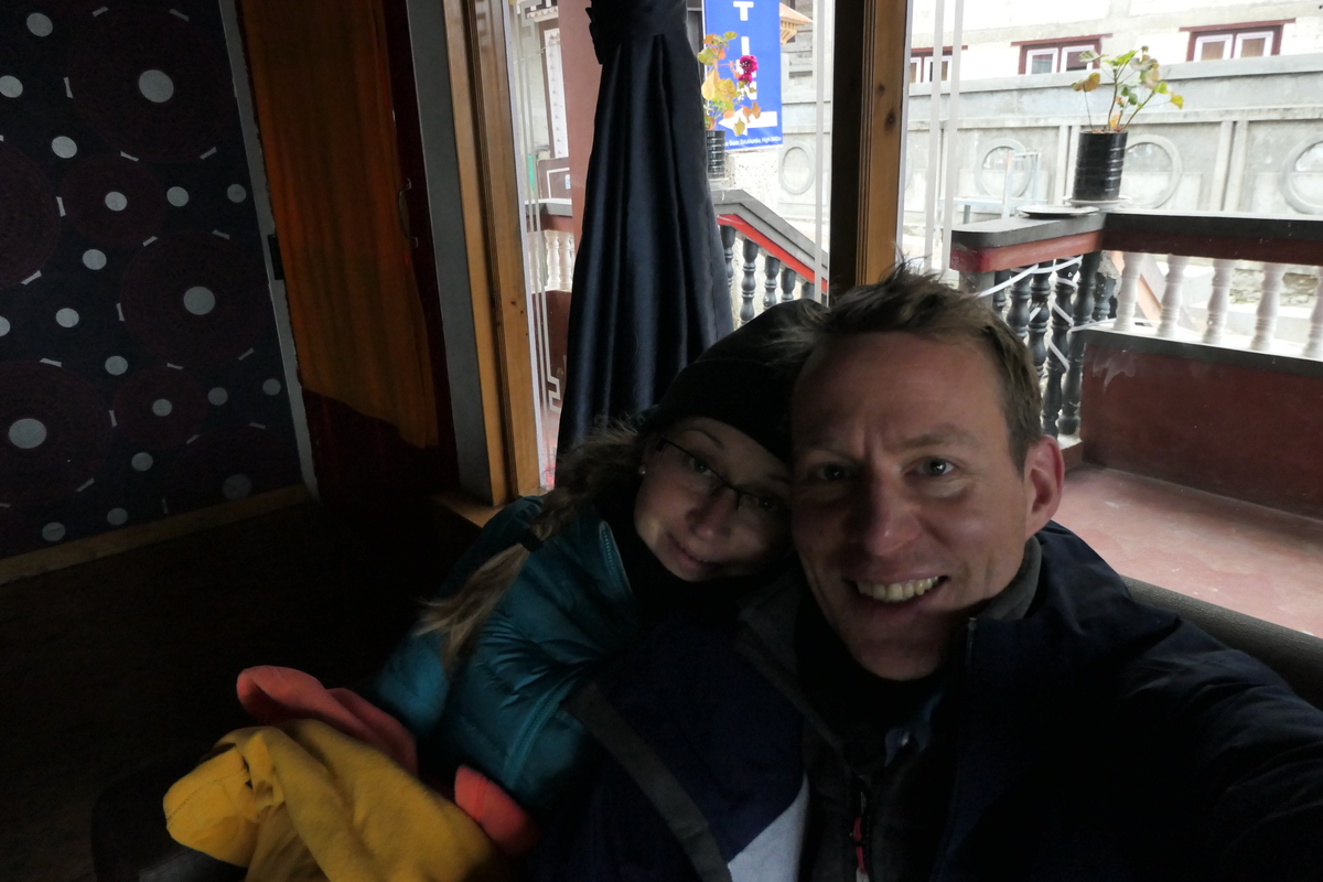 Die Gruppe von Caroline begrüsst uns im Aufenthaltsraum, dafür sind wir aber wirklich zu kaputt. Das ist uns gerade nicht wirklich angenehm. Wir gehen also kurz aufs Zimmer weil wir kaputt sind. Im Zimmer geht es uns aber schlagartig schlecht: Miri zeigt starke Anzeichen von der Höhenkrankheit mit Kopfschmerzen, grosser Übelkeit, kalt, ausser Atem und starken allgemeinen Erschöpfungserscheinungen. Miri kauert im Bett, möglichst wenig Bewegen, der Kopf pocht. Tim ist ebenfalls sehr kaputt. Aber es hilft doch nichts. Manraj kommt nach einiger Zeit nachfragen. Miri zwingt sich ein paar Gummibärchen und Kinderschokolade sowie Pumpernickel aus Deutschland (unsere Notrationen) zu essen um so schnell etwas aufputschenden Zucker zu bekommen, Manraj bring Tee und eine Cola. Irgendwann wird es wieder etwas besser. Miri zwingt sich eine halbe Knoblauchsuppe zu essen, einem natürlichen Gegenmittel gegen die Höhenkrankheit. Wir sind uns zu diesem Zeitpunkt nicht sicher, ob es am nächsten Tag überhaupt weitergehen kann.