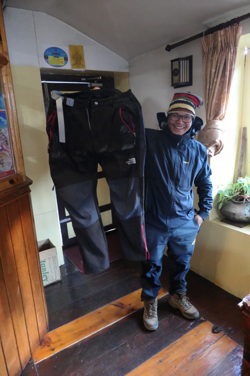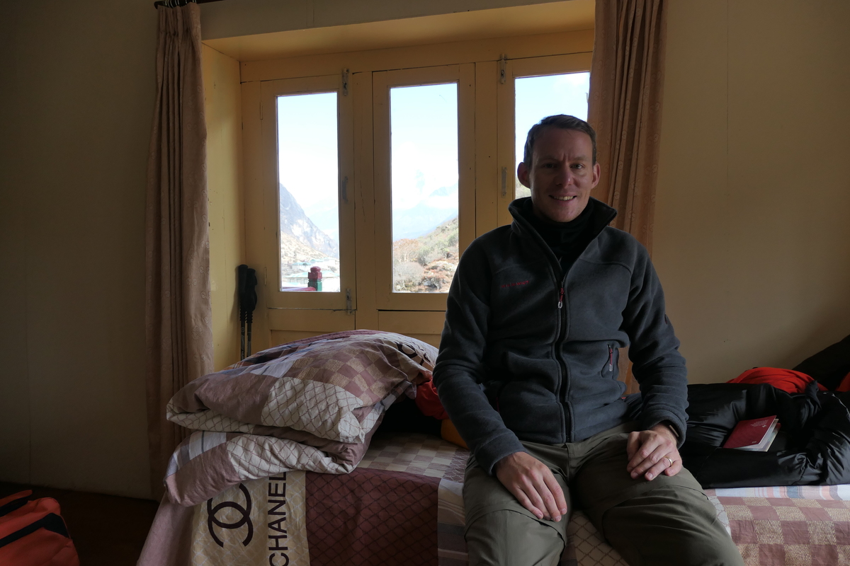 Inspiriert vom Japanischen Luxus gönnen wir uns ein Zimmer mit eigenem Badezimmer mit direktem Blick auf den Ama Dablam (das Matterhorn Nepals) für 10 Dollar die Nacht. Hier könnten wir sogar eine heisse Dusche in unserem eigenen Badezimmer nehmen. Wir entscheiden uns aber dagegen. Einerseits fällt uns das schwer, Sonnencreme und Anstrengung abduschen wäre schön. Andererseits ist es eine einfache Entscheidung: es ist ab nachmittag und abends kalt, die Vorstellung die Kleidung auszuziehen ist überhaupt nicht schön. Ausserdem hat uns Manraj gewarnt, zu Duschen auf einer Höhe spätestens ab 4000m kühlt den Körper stark aus. Danach wird man praktisch automatisch krank. Wir wollen also so kurz darunter kein Risiko eingehen.