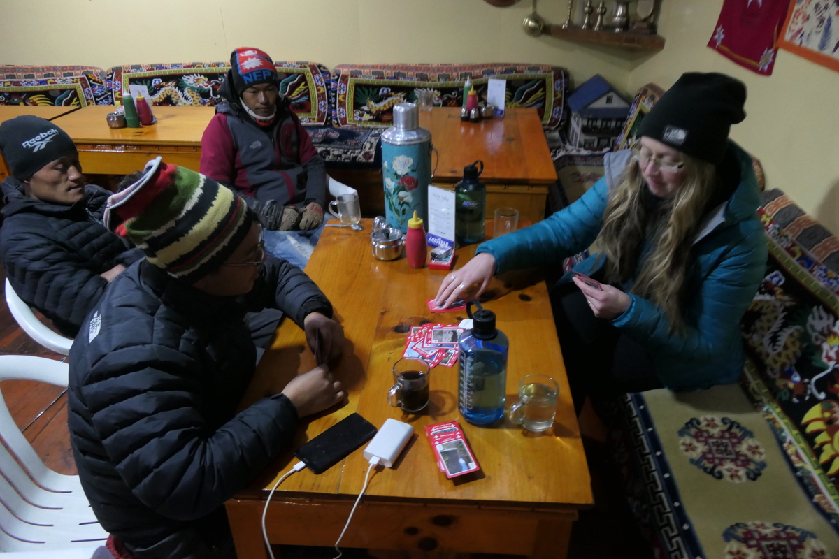 Dal Bat und Tee ist unser Mittagessen. Nachmittags steht Kartenspielen an sowie eine Partie Billard. Wir treffen einen Deutschen, der in der Luxusunterkunft im Ort ist. Er sei umgekehrt mit einem Begleiter. Bei seinem Begleiter ging es ab 4000m nicht mehr. Er hatte zu starke Höhenprobleme. Oh… aber wir machen uns noch keine zu starken Gedanken, wir haben ja sehr viele Akklimatisierungstage eingeplant. Kein Problem!