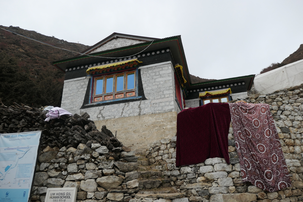 Zurück im Teahouse geniesst Miri eine Nudelspuppe und Tim eine Eiersuppe. Am Nebentisch sitzt ein Ostdeutsches Pärchen welche eigentlich die 3 berühmten Mountain Pässe machen wollten. Auf dem Weg nach Gokyo (4750m) mussten sie allerdings umdrehen, da die Frau sehr schwere Komplikationen mit der Höhenkrankheit hatte. Sie haben sich aus diesem Grund von ihrer Gruppe getrennt und machen nun mit einem der Träger eine Wanderung mit verschiedenen tiefer gelegenen Zielen. Ihre Ausführungen machen uns ein wenig Sorgen. Sie erzählen uns auch von den ständigen Toiletten-Gängen in der Nacht, was wir noch nicht ganz so stark nachvollziehen können…erst einen Tag später werden wir das auch noch stärker zu spüren bekommen.